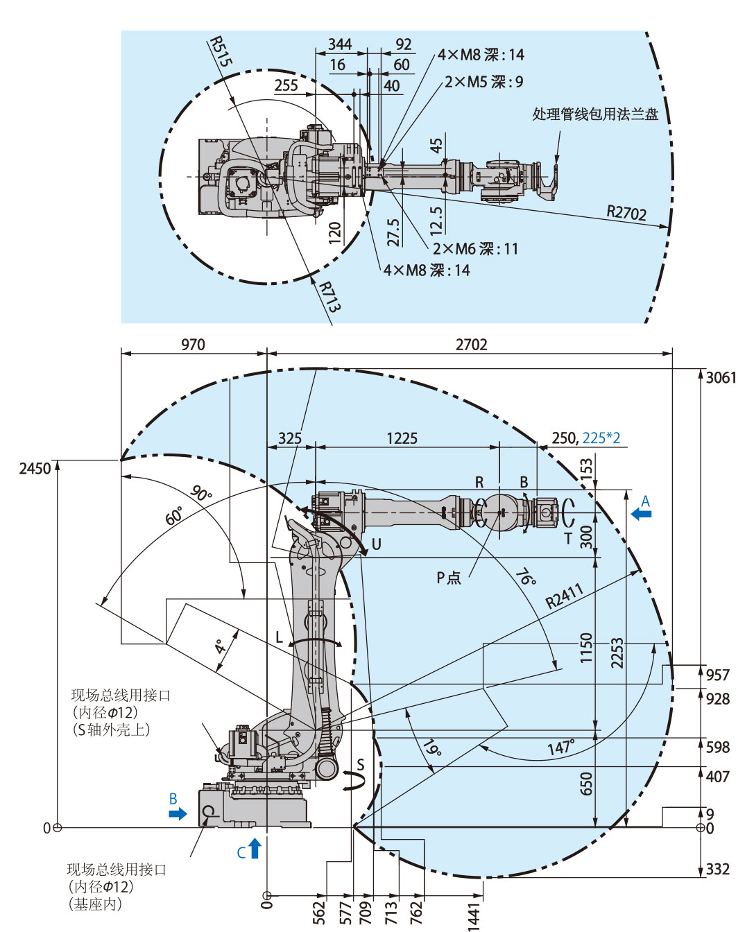 通過新型減震控制實現(xiàn)高速化;擴大搭載點焊槍時動作范圍;機器人小型化,細長化實現(xiàn)高密度配置;提高負載質(zhì)量,節(jié)省布線。