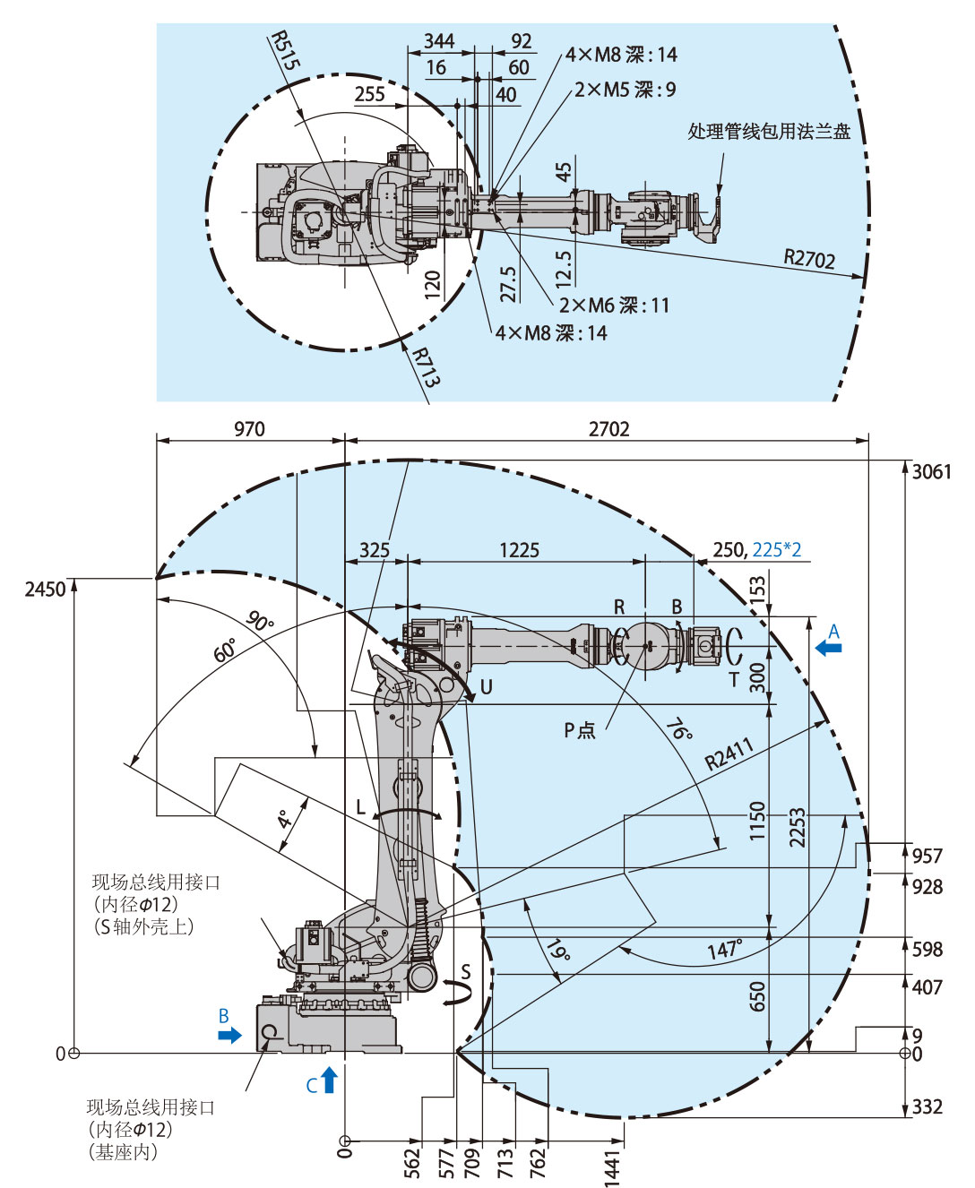通過新型減震控制實(shí)現(xiàn)高速化;擴(kuò)大搭載點(diǎn)焊槍時(shí)動(dòng)作范圍;機(jī)器人小型化,細(xì)長(zhǎng)化實(shí)現(xiàn)高密度配置;提高負(fù)載質(zhì)量,節(jié)省布線。